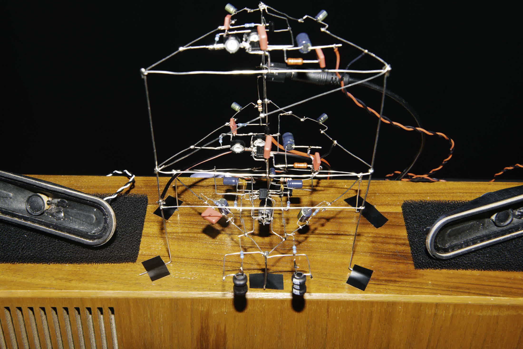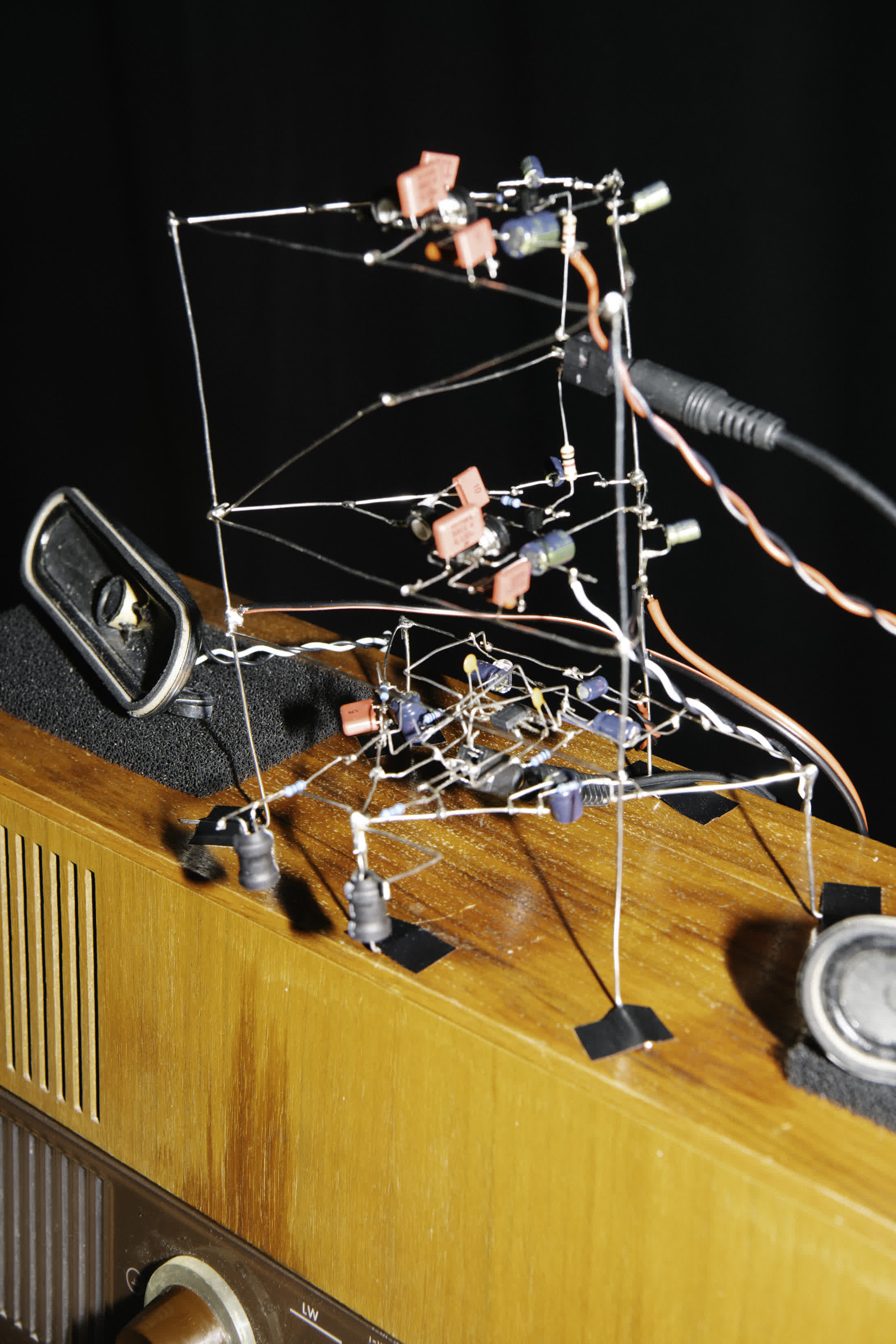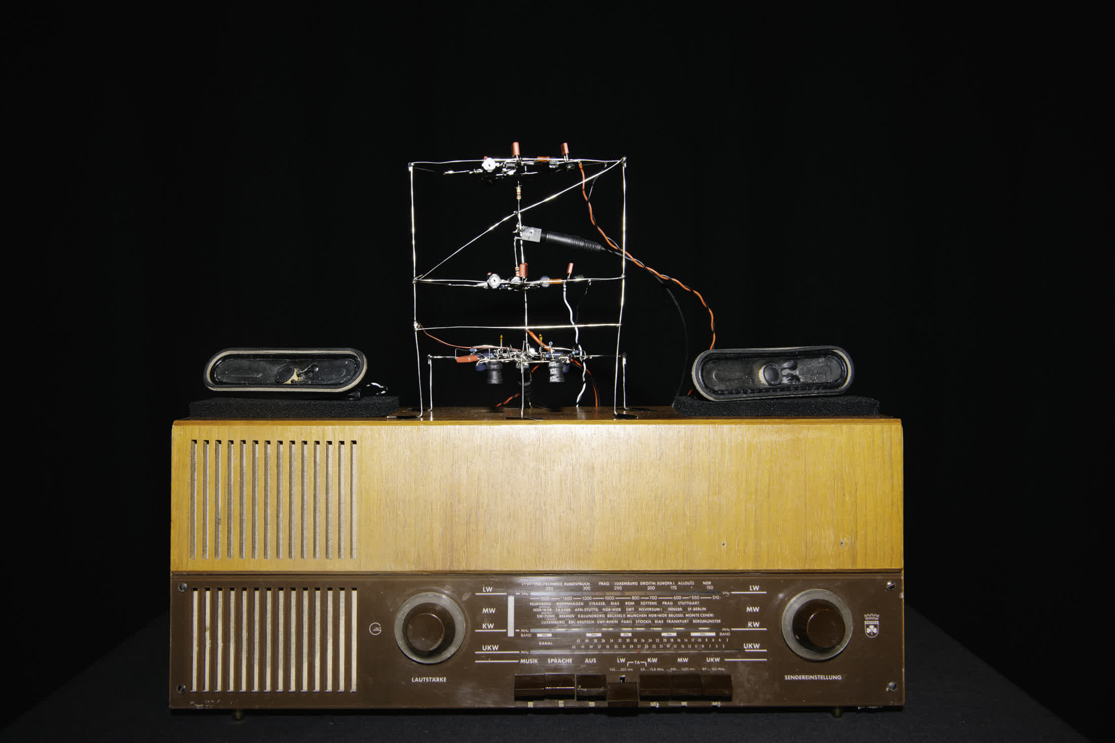An old valve radio would serve as a base for the sculpture and as a source of strong EMI.